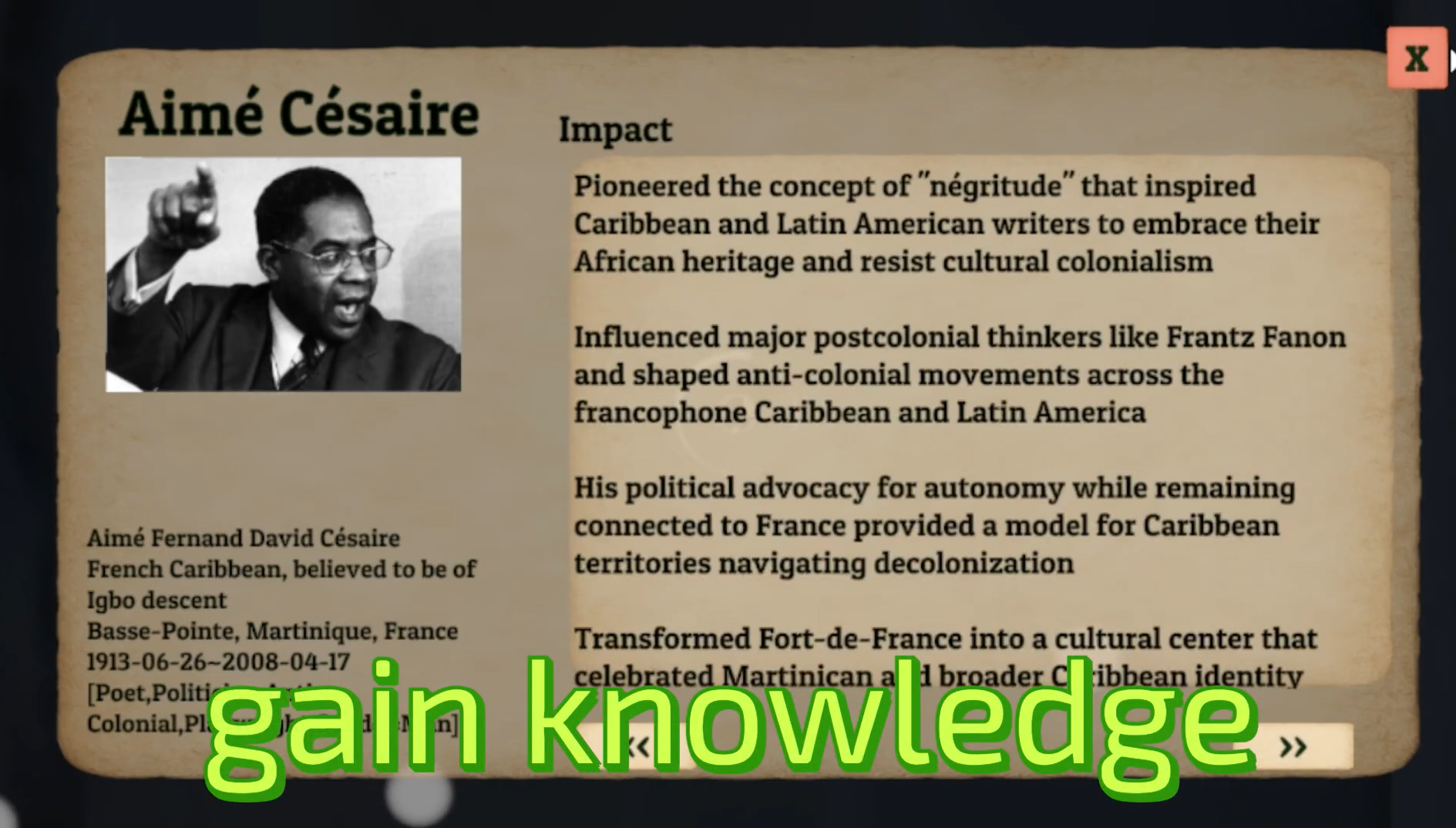 - Learn stuff - tap nodes to read about the people and earn knowledge points